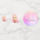 Fille et confettis féminin pour votre Quinceañera, 15ème anniversaire de table de table. L'arrière - plan en violet et rose, décoré de parties scintillant de couleur arc-en-ciel goutte de violet, rose. Personnalisez et ajoutez une date et un nom/âge. Lettres de couleur grise. Quelques jetons de confetti avec nom et date, d'autres avec le texte : Joyeux Anniversaire écrit avec un script à la mode manuscrit avec des swashes. Ajoutez votre propre photo sur deux des puces.
