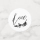 Table mariage romantique confetti personnalisé avec des photos, votre monogramme à l'intérieur d'une couronne de laurier, le mot amour, et votre mariage date avec des polices noires contre un arrière - plan blanc.