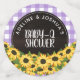 Table de baby shower rustique violet en vichy barbecue confetti avec tournesol, un coeur mignon, et deux photos.