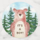 Joli design bébé garçon avec un ours brun avec une forêt d'épinette verte et le ciel bleu aquarelle. Facile à personnaliser avec vos informations. Visitez notre boutique pour voir toute notre collection d'ours d'aventure forestier.