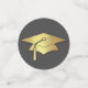 This modern design features a graduation hat and confetti in gold on a background of grey with white text.