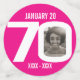 70e anniversaire rose vif et blanc rayures graphiques et confetti de partie de texte. Idéal pour ajouter une touche personnelle à une fête d'anniversaire surprise. Personnalisez avec trois de vos photos d'anniversaire de filles dans le 0 de 70 et personnalisez avec votre choix de nom. Conception par Sarah Trett pour www.mylittleeden.com
