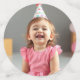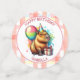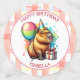 Adorable capybara personnalisé confetti d'anniversaire avec photos, âge et nom. Un capybara douce à l'aquarelle tenant un ballon et un cadeau d'anniversaire en rose et bleu.