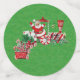 Ce confetti de table a de grands cercles avec le Père Noël à bord d'un train de bonbons à la menthe poivrée transportant des lettres à Père Noël et des sucres de canne sur un arrière - plan vert avec des éclats d'or. Le milieu cercles faux parties scintillant or avec le texte rouge Joyeux Noël. Les petits cercles sont rouge vif avec des étoiles dorées.