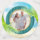 Améliorez vos tables de réception de mariage avec ce design lumineux et joyeux, avec des plages de sable blanc et doré et des ciels bleus rehaussés par des lumières de bokeh, décoré de bijoux en pierres émeraude, arc turquoise, coquillages et feuilles de palmiers frais. Votre photo de couple Instagram préférée est présentée sous un cadre rond avec bande dorée brillante. Parfait pour les mariages sur la plage, les mariages de destination, les mariages tropicaux, les mariages insulaires, les mariages d'été et d'autres lieux liés à la mer. Visitez la collection pour voir l'ensemble de la suite. (REMARQUE IMPORTANTE : Cette conception n'est pas faite de pierre à gemme ou de tissu réel. Tous les éléments sont des graphiques ou des photos numériques et imprimés sur une surface plane.)