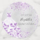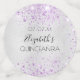 Elégante et glamour et fille pour une Quinceañera, 15ème anniversaire fête. Un arrière - plan métallique à l'aspect faux argent décoré de poussière de parties scintillant violet et d'une robe. Personnalisez et ajoutez un nom et une date. Le texte : Quinceañera et le nom sont écrits avec des scripts de style moderne. Ajoutez votre propre photo sur deux des puces.