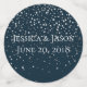 Ce confetti de table est montré dans une couleur bleu marine avec un motif d'impression d'étoiles argent petite également avec un échantillon personnalisé de noms de mariage. Customisez et modifiez les noms et la date à votre place.