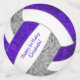 Ce joli confetti d'anniversaire de volley-ball féminin présente des volleyballs violets, gris et blancs avec un accueil personnalisé "Joyeux anniversaire" et le nom de la fille - par katz_d_zynes