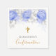 For an elegant confirmation. A chic white background. Decorated with blue, white florals, roses and a faux gold cross. Personalize and add a name. Black and golden letters.