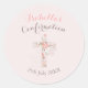 Elegant classic round confirmation sticker for girls with a floral cross on a blush pink background. Personalize with name, text and date.