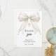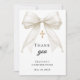 A modern and elegant Confirmation thank you card. A white background, decorated with a large ivory colored bow with pearls and a golden cross. On the front the text: Thank You, name, and a date.