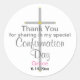 Elegant Thank You Confirmation Daughter round stickers. Simple hand-painted silver cross with gold accents against a white background. Personalize with your child's name in pretty pink text and date of Confirmation in black text. Original Graphic Artwork and Design © TamiraZDesigns.