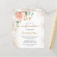 A white background decorated with eucalyptus greenery, a rose gold and blush pink rose, and golden leaves and faux gold glitter drops. Personalize and a name and ceremony details. Black and golden coloured letters.