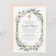 Design is composed of delicate watercolor floral flower botanicals and green greenery leaf foliage on a simple white background. A simple faux gold cross adorns the geometrical frame.