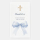 A white background color. Decorated with a large light blue colored bow and a golden cross. Personalize and add the name and date.