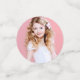 A rose gold faux metallic, foil looking background decorated with faux rose gold glitter drips. Personalize and add a date and name/event. Dark rose gold coloured letters. Some confetti chips with name and date, others with a cross. Add your own photo on two of the chips.