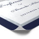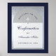 A simple but modern religious design. On a navy blue rectangular background, it has a faux silver foil arch that has inside navy blue text on white background. The word Confirmation and the name are written in an elegant calligraphic script; the first line is arched text.