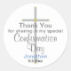Elegant Thank You Confirmation Son round stickers. Simple hand-painted silver cross with gold accents against a white background. Personalize with your child's name in blue text and date in black text. Original Graphic Artwork and Design © TamiraZDesigns.