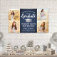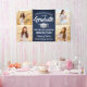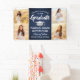 Add a personalized touch to college or high school graduation party decorations with this custom 4 photo collage navy blue, white and silver banner. (IMAGE PLACEMENT TIP: An easy way to center a photo exactly how you want is to crop it before uploading to the Zazzle website.) Design features a blue ombre background, faux brushed stainless steel mortar board cap, stylish modern typography, handwritten style script calligraphy, and four photos of the graduate, such as senior pictures or images from the commencement ceremony. Please note that silver is printed color, not metallic foil. This party sign is an elegant way to celebrate the special day. Congratulations to the graduate!