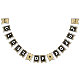 Elegant graduation party bunting featuring a black and gold theme, including stylish faux gold glitter, mortarboards, stars, the words "congrats grad" and the class year.