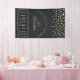 Congrats Graduate party banner with gold coloured circles / confetti. A gold coloured illustration on a black-grey background. Designed with an illustration of a mountain with the suns rays shining outward from behind. Typography says: Good Luck on your next Adventure explore dream discover.