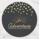 Table confetti with a gold coloured illustration on a black-grey background. Designed with an illustration of a mountain with the suns rays shining outward from behind. Typography says: Life is an Adventure explore dream discover. Other text also says: Class of 20XX and Congrats 20XX
