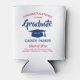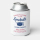Add a personalized touch to college or high school graduation party decorations with red, white and blue can coolers. Design features a white background, blue mortar board cap, stylish modern typography, handwritten style script calligraphy, and a customizable message reading "Congratulations to our Graduate". Text at the bottom includes class year, school name, and an optional line for degree, honours, or other info. All text is simple to customize. These elegant favours make a stylish graduation celebration drink idea. Cheers!
