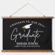 Modern graduation Wood Topped Wall Tapestry featuring bold white lettering with an black background. The design features a white graduation cap with the phrase "Congrats to our Graduate". Personalize the black graduation sign by adding the graduate's name, school name, and graduation year. For a more custom look, change the background to your school colours. The graduation poster is perfect to use for your high school or college graduation party!