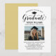 Elegant graduation announcement card and graduation party invitation congratulates and announces your grad in style! Features black grad cap, "Graduate" in script, and modern custom text that can be personalized with the graduate's name, school, and party details. Add a favourite photo of the grad. Note, the champagne gold accent colour on the back of the card can be changed to white or another colour that coordinates with the photo or party colours.