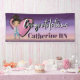 Modern congratulations sign for features a cute nurse who has graduated from nursing school. She has a big heart and enjoys caring for others. Typography style fonts. Monogrammed with graduates name. Purples, pinks, black and blue colours. Faux gold glitter look. Congrats to the new RN Registered Nurse.