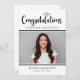 Stylish and elegant photo graduation announcement and party invitation features "Congratulations" in a trendy calligraphy script font with silver coloured grad cap motif and a landscape photo of the grad. Personalize the modern custom text and a two-sided design for the open house details. Simple and minimalistic black and white design with silver grey coloured accents.
