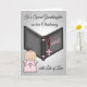 Congratulate your granddaughter on her baptism with a card featuring an adorable baby girl in front of a grey and pink bible with a red rosary on a gradient background with black text. Design by Laurie Schneider/Elements by Scrappin Doodles
