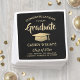Add an elegant personalized touch to college or high school graduation party decorations with these custom black and gold paper napkins. All text is simple to customize. Design features a black background, faux foil mortar board cap, stylish modern typography, and handwritten style script calligraphy. Please note that gold is printed colour, not metallic foil. Congratulations to the graduate!