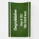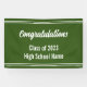 This dark green and white high school graduation banner has a text template you can edit to congratulate your school's graduating class. As shown, the top line is a white script that reads 'Congratulations'. The second line can be changed to the class year if necessary. The final line is for the school name. All text can be edited or deleted.