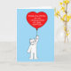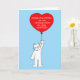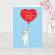 A large white fluffy cat holding a large red balloon with the words 'Congratulations on finalizing your adoption' on it.