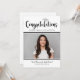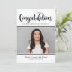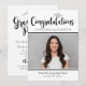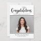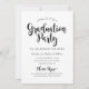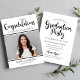Celebrate your graduate with this modern black and white graduation party invitation featuring bold script “Congratulations” and a silver graduation cap accent. Add a favourite photo and customize the name and school details. The back side includes matching “Graduation Party” typography with clean, easy-to-read party information.