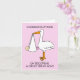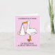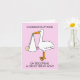 A cartoon of a giant stork holding a baby in a white sheet from it's beak. The image is set against a pale pink coloured background and accompanied by the words 'Congratulations on becoming a great great aunt'.