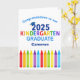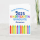 This adorable 2025 kindergarten graduation card features a cool grad cap above colourful writing and a row of crayons in rainbow. Cute customizable kindergartener graduate congratulations card in fun colours for the last day of elementary school with your kid's name personalized in blue. Congratulations to our kinder grad!