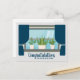 Congratulations on your new home. A beautiful happy housewarming postcard featuring a pretty windowsill filled with cute succulent plants. The window is covered with beautiful blue drapes above your congratulatory text.