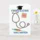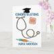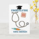 A personalized nurse graduate card featuring a graduate cap, stethoscope, band-aid and a needle. You will be able to easily personalize the front of this nurse graduate card with the nurse's name in blue text. The inside reads a congratulations graduate message hat can be personalized by you and the back features a grad cap along with the class year, which you can also personalize. This nurse grad card is a great keepsake for the nurse grad.