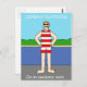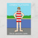 A man with a large moustache, wearing a swimming cap and red and white stripped bathing outfit, stands on a lake side. The words 'Congratulations on an awesome swim' accompany the image.