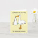 A simple illustration of a stork holding a baby in a white sheet which hangs from it's beak. The image has a lemon colored background and is accompanied by the words 'Congratulations on becoming a cousin'.
