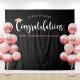 Extra large graduation ceremony or party backdrop for all of the graduates' photos! Design is minimalistic and features a modern white "Congratulations" calligraphy script design with rose gold grad cap accent on a black background. Personalize the custom text with the class year and school name.
