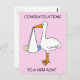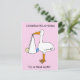 A giant cartoon stork holds a baby boy in a white sheet which hangs from the stork's beak. The image has pastel pink background.