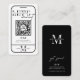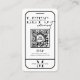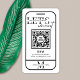 Connect with your customers with a modern social media business card. This minimalist black and white QR code card features a big mobile phone icon, URL code in the middle and space for your business details. The script fonts and cut through letter effect adds an extra detail to this company card design. This scan with a phone design makes this QR link personalized social media cards really stand out.