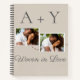 Beige background notebook journal with two small white-trim photos connected by a dotted thread line. Above the images are large serif initials. Below, a soft script reads “Woven in Love,” adding a meaningful touch to this faded charcoal design.