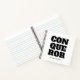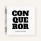 This is a personalized Christian motivational notebook, designed with the word CONQUEROR in bold black typography. On the reverse, there is a Christian Bible verse based on Romans 8:37 - "We are more than conquerors through Christ who loved us", which is perfect for anyone who loves motivational quotes. The placeholder name on the front and the Scripture verse on the reverse are CUSTOMIZABLE, so you can personalize with your preferred wording and/or add your name(s).