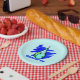 Plates with large water drop with the earth mapped onto the drop and the words "Conserve," to get people thinking about water conservation.
