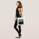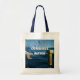 Conserve water tote bag with bolt and wrench on blue lake background.