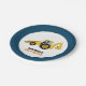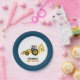 Plate features a construction theme with a navy blue border and a yellow backhoe in the middle. Customize the text with your own details, or delete to use without text. Great for a construction theme baby shower or birthday party!